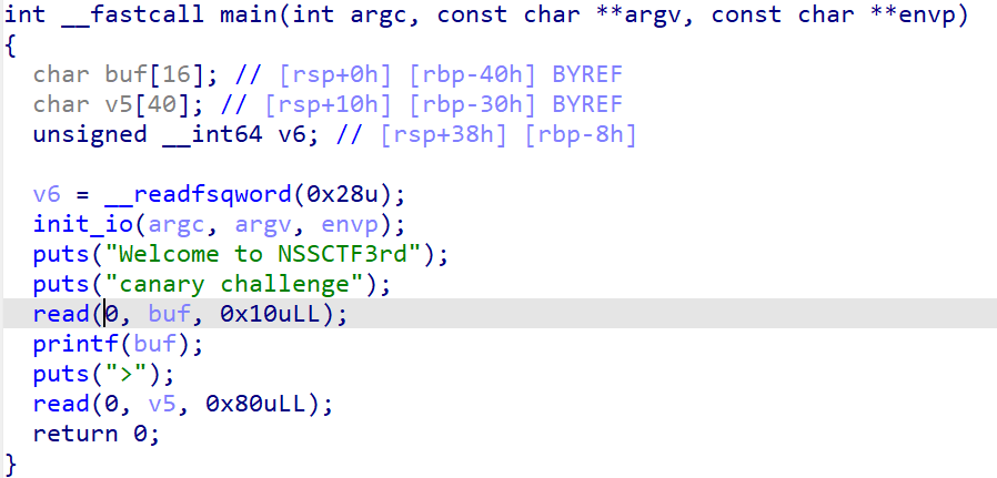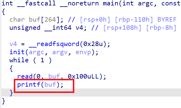 ida速览 1 2 3 4 5 6 7 8 9 10 11 12 int __fastcall main (int argc, const char **argv, const char **envp) { char buf[256 ]; unsigned __int64 v5; v5 = __readfsqword(0x28 u); init(); puts ("-----" ); read(0 , buf, 0x110 uLL); printf (buf); return 0 ; }