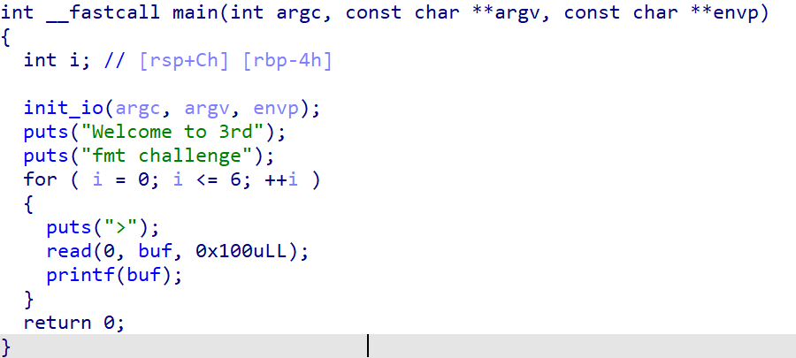 1 2 3 4 5 6 7 8 9 10 11 12 int __cdecl main (int argc, const char **argv, const char **envp) { char format[68 ]; setvbuf (stdin, 0 , 2 , 0 ); setvbuf (stdout, 0 , 2 , 0 ); puts ("Welcome to my ctf! What's your name?" ); __isoc99_scanf("%64s" , format); printf ("Hello " ); printf (format); return 0 ; }