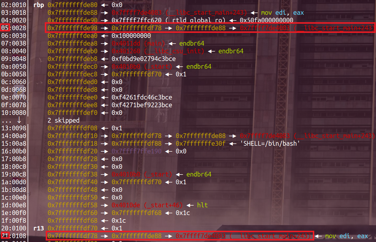 如图,为了修改__libc_start_main,我们选定的结构是下面画框部分,可以发现画框部分的地址,与libc_start_main前面的地址相差不大,我们就成功地找到了”朋友”