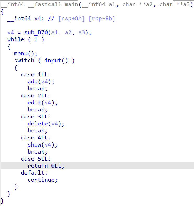 - 构造五个chunk,chunk0用来溢出chunk1,chunk1,2用于uaf,chunk4用来泄露libc,chunk3溢出修改chunk4
