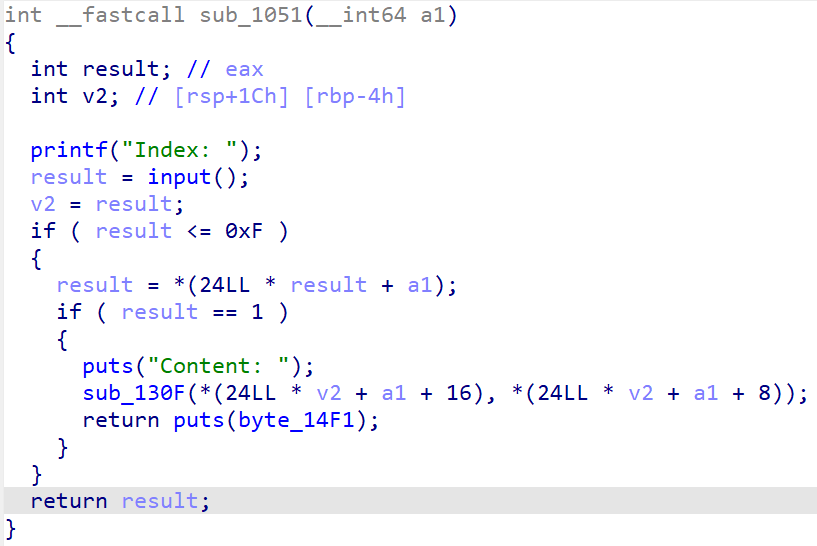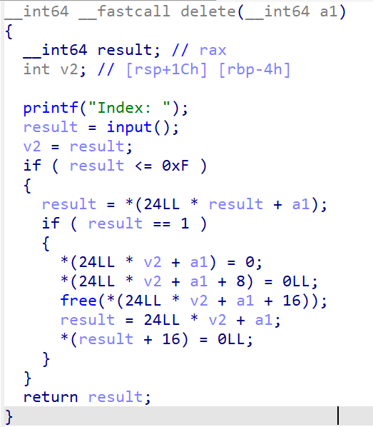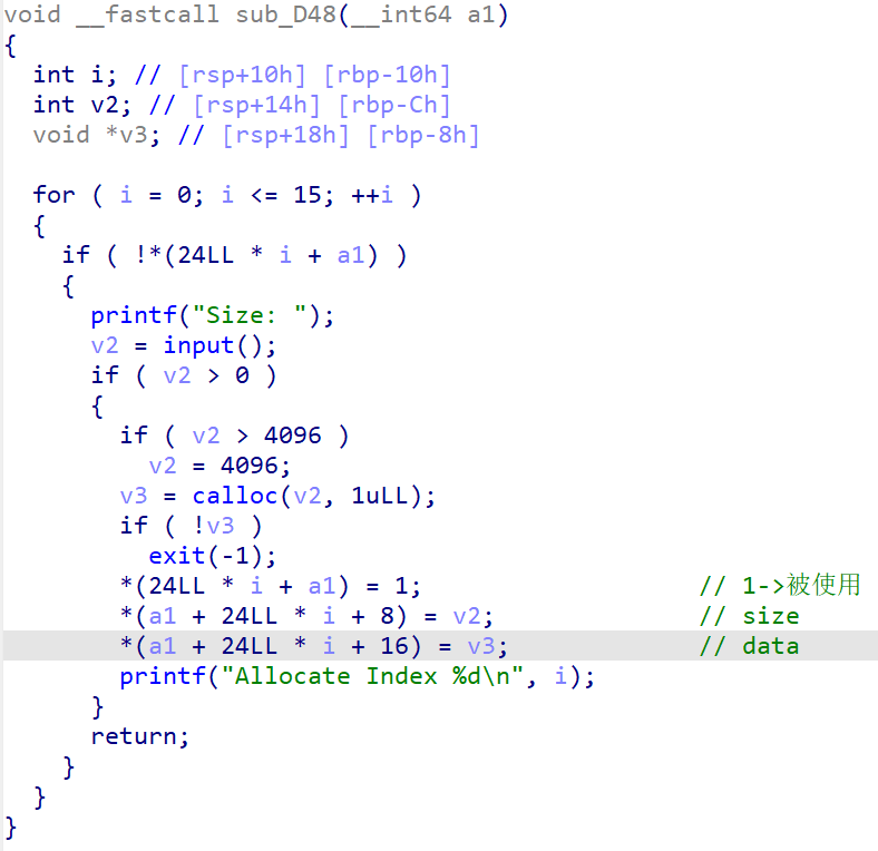 - 然后将1,2都回收回来,注意虽然1->fd修改为了chunk4,但是add的函数中for循环从小到大,只要满足”标志位”是0就分配,而chunk2的标志位free之后始终为0。