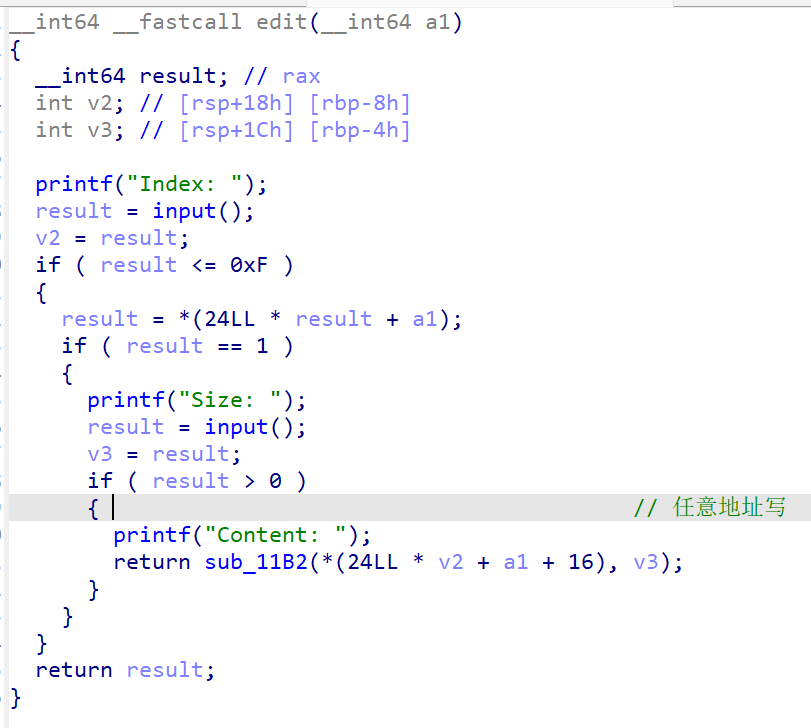 - 漏洞点在edit函数,未对size检查,可以实现任意地址写