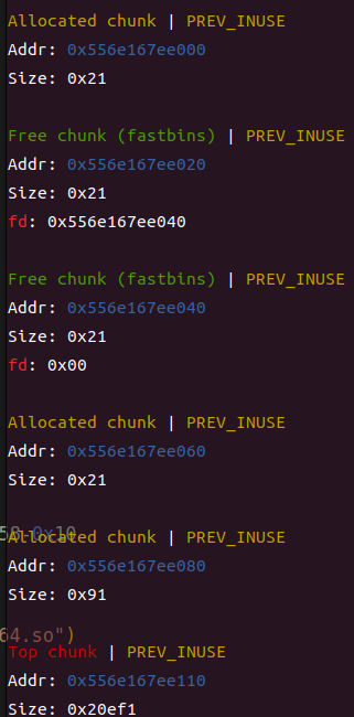 - 查看堆布局,看看如何使得两个地址共同控制一个chunk: