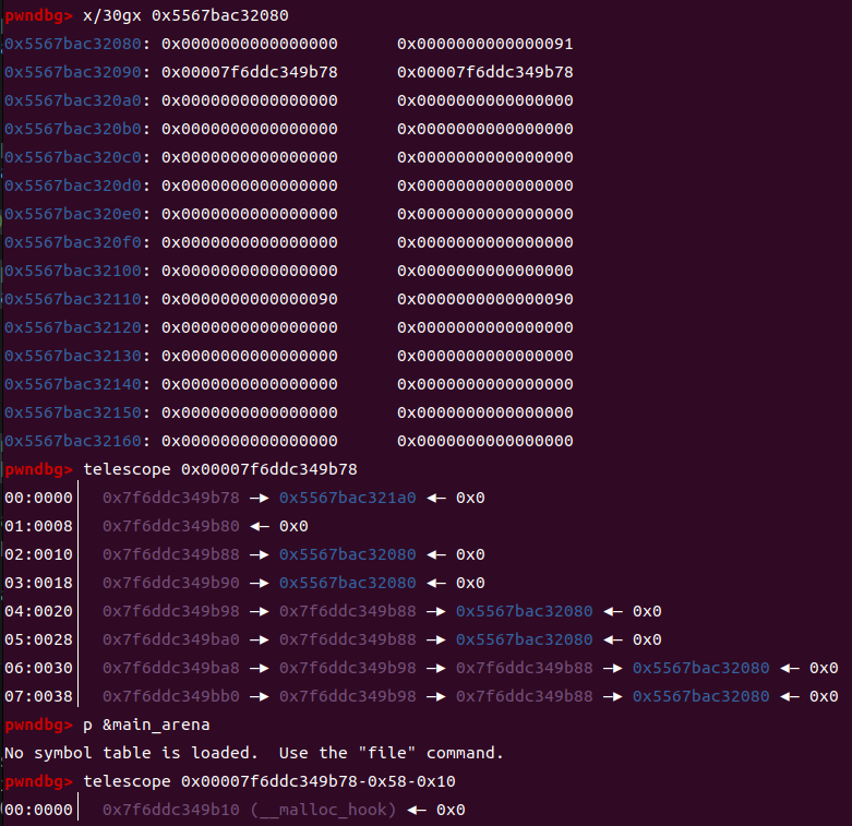 - 但是运用arbitrary_alloc需要uaf修改fastbin中chunk的fd指针,因此需要我们两个地址控制同一个chunk,看下面调试吧。