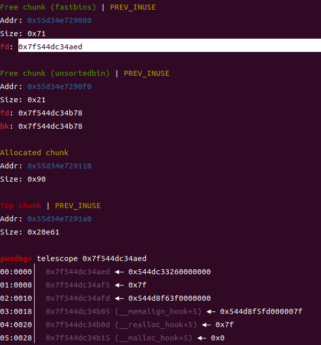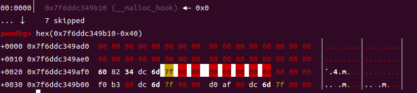 - 该chunk的地址可以从图上看出:malloc_hook-0x13-0x8(size)-0x8(prev_size)