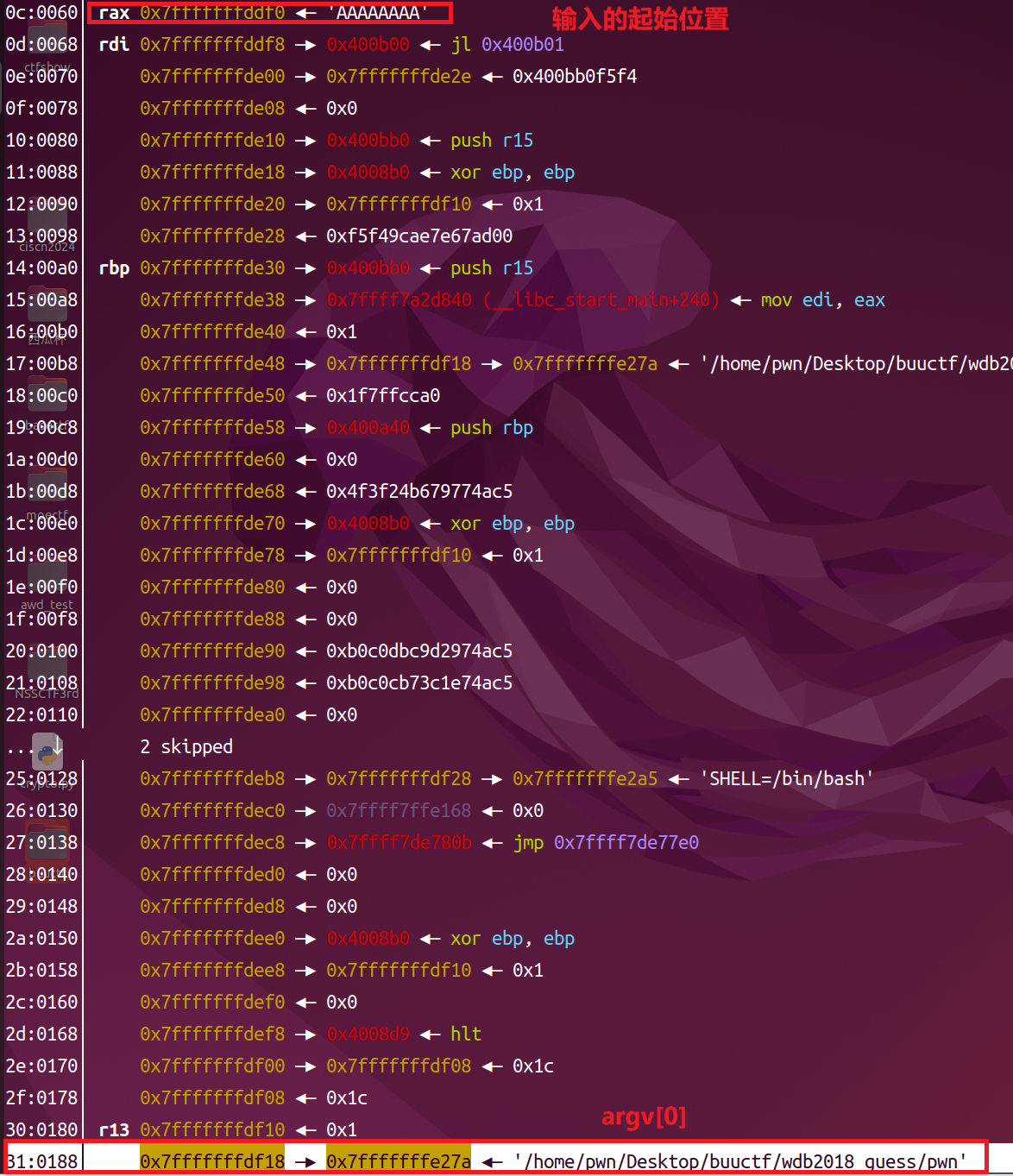 发现报错部分出现了程序的名字,那么这个是什么呢?这个其实就是argv[0],也就是说argv[0]会随着canary报错的时候输出出来,那如果我们将其改为某个函数的got表的内容,那是不是就可以输出其真实地址了,达到泄露libc的作用,下面来看看栈布局: