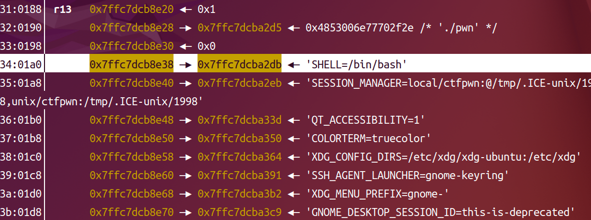 光标处就是__environ的地址,很明显该地址是在栈上的,因此我们泄露出该地址,就可以获得栈地址了.