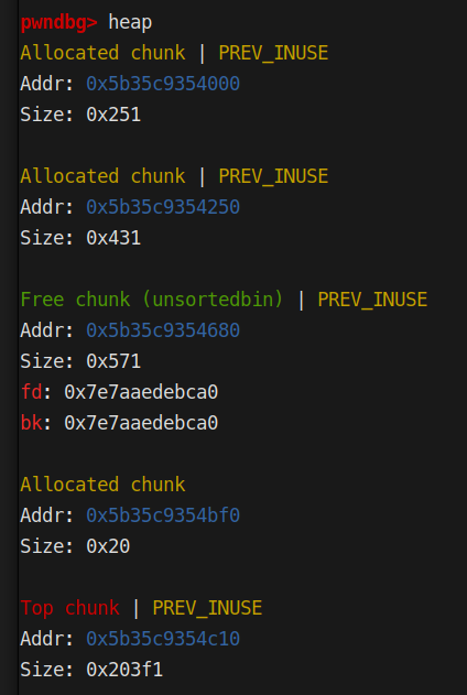 add(0x420,b'0') add(0x68,b'1') add(0x4f0,b'2') add(0x10,b'3') free(0) free(1)