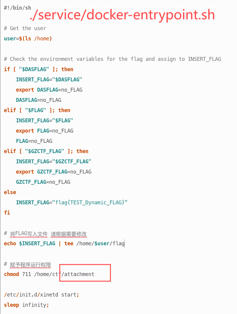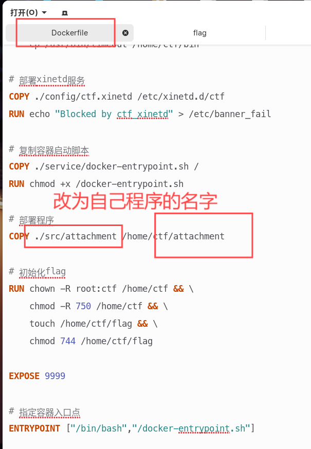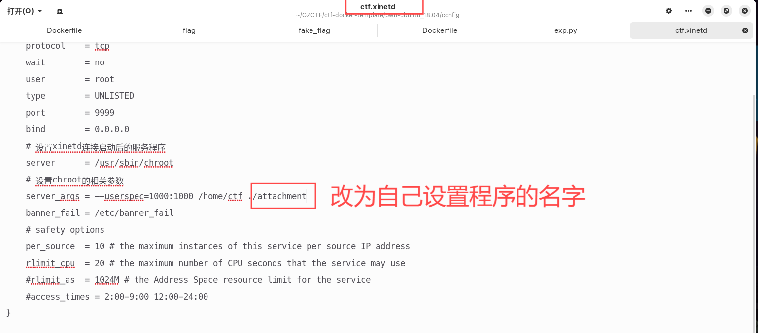 ./config/ctf.xinetd、./Dockerfile和./service/docker-entrypoint.sh中进行修改