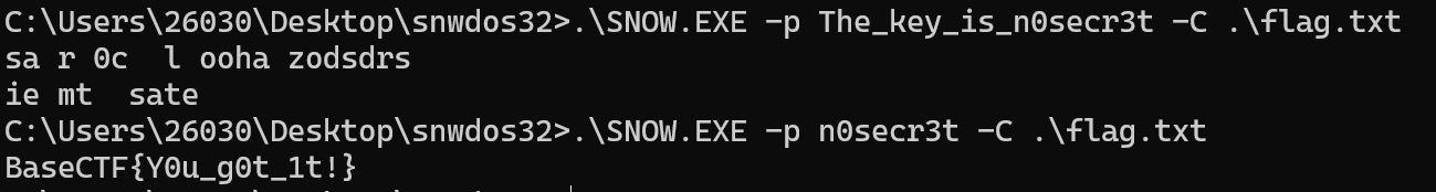 .\SNOW.EXE -p key -C .\flag.txt[解密].\SNOW.EXE -C -m "message" -p "key" infile outfile[加密]加密表示将隐藏文件infile中的message用key加密,储存在outfile中
