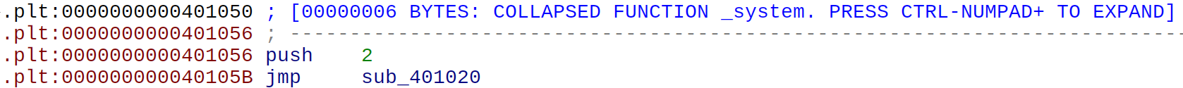 push 2:将值2压入栈。这通常用于标识该PLT条目,表示它是system函数的第 2 个条目(索引2),用于传递给链接解析器。jmp sub_401020:这是跳转到PLT的解析器函数,用于解析动态链接库中的函数地址。为什么是