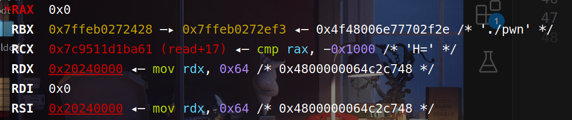 read?观察执行shellcode前的寄存器,rax=0,只要syscall就会执行read