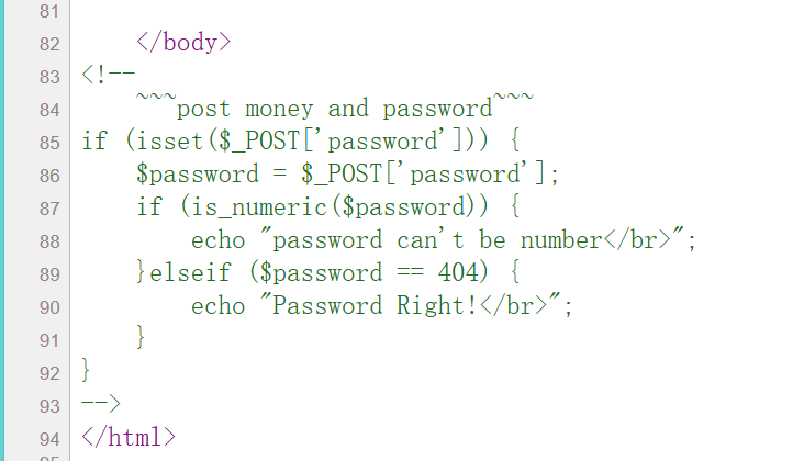 ==,这是个弱比较,会在某些情况下将$password的类型隐式转换,即我们输入404a(404后面无所谓什么字符)==会略过非数字型,直接比较404,这样就绕过了判断。
