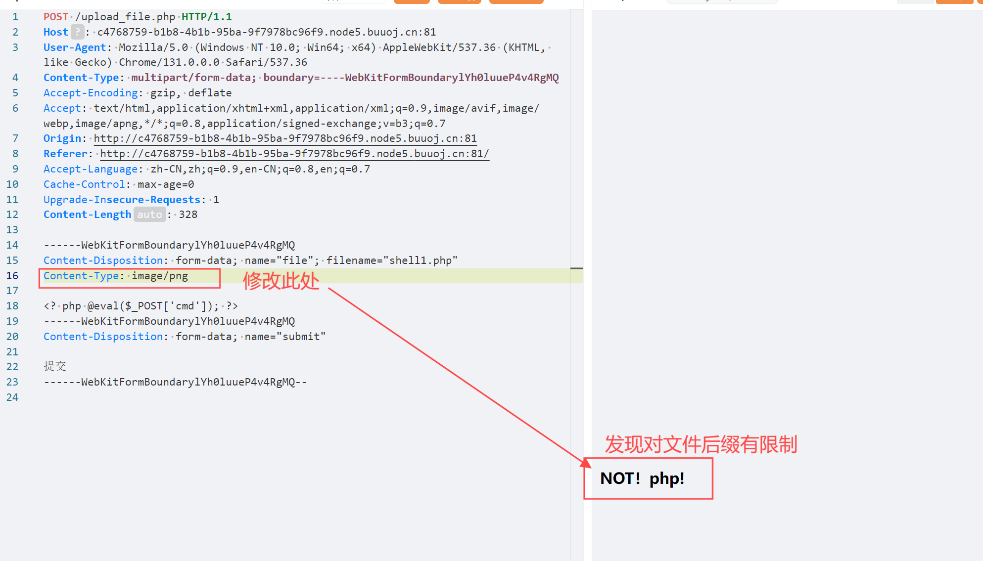 - 这里发现有对文件后缀经行检查,但是这只是服务器端前端的检查,我们抓包之后修改后缀即可,抓包之后修改的是后端的内容: