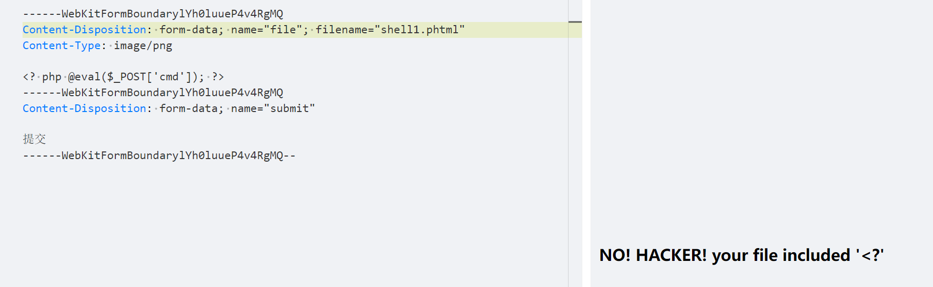 - 步骤和上一道题目一样,开始直接传入简单的一句话木马,然后说后缀不能含有ph,那么和上一道题目一样修改